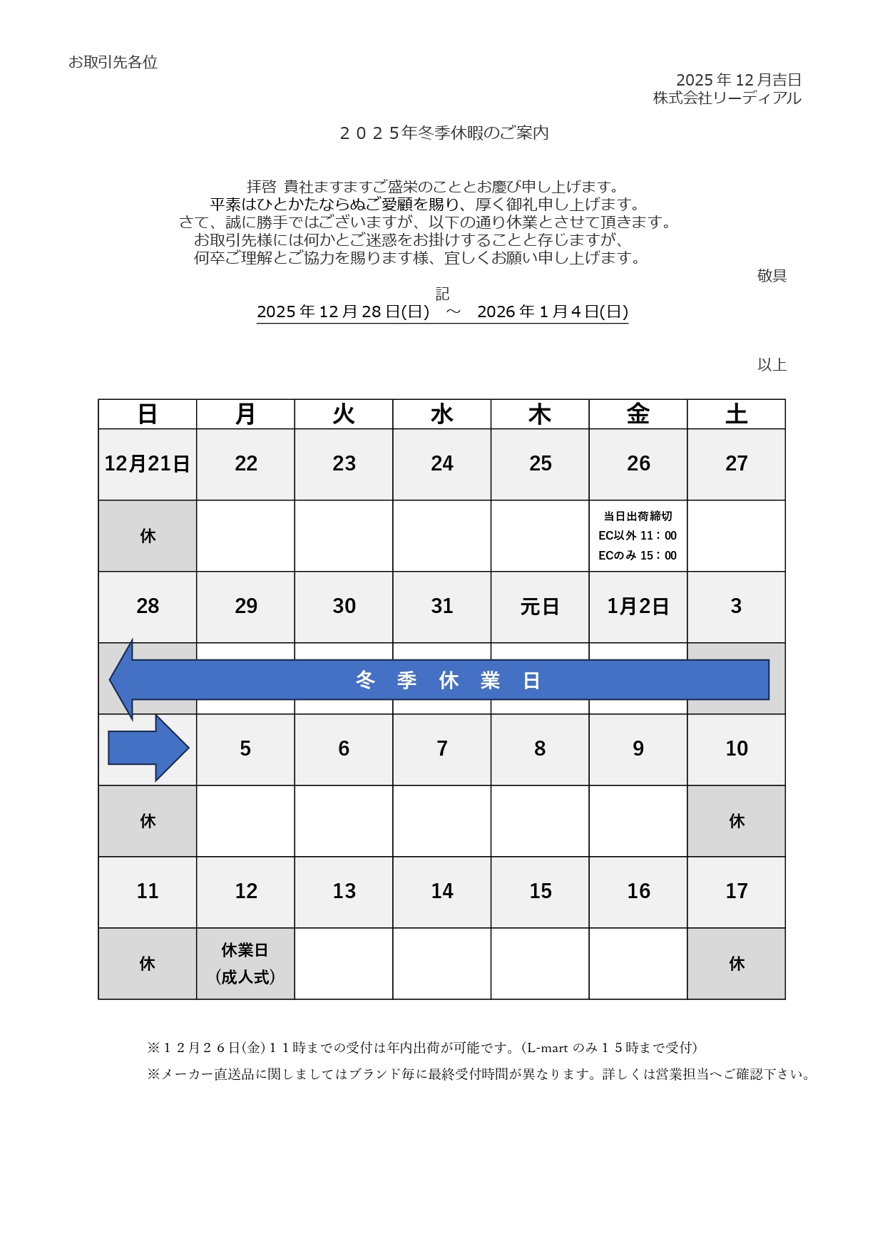 【冬季休業期間】
